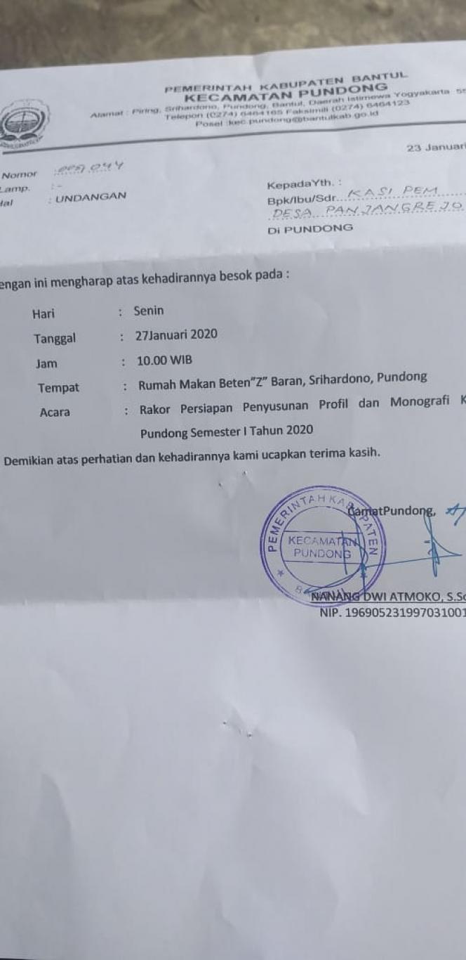 Pada hari senin 27 januari 2020 pukul 10.00 wib di R.M Betenkz Baran Srihardono Pundong diadakan rakor persiapan penyusunan profil dan monografi tingkat kecamatan semester 1 tahun 2020. Wakil dari Desa Panjangrejo adalah Bpk Tujiyo selaku Kasi. Pemerintahan dan di hadiri oleh Kasi Pemerintahan se Kecamatan Pundong atau yang mewakili dan di hadiri pula oleh pendamping Kecamatan.Dalam hal ini membahas juga tentang nilai evaluasi perkembangan Desa (lomba Desa ) tahun 2020.