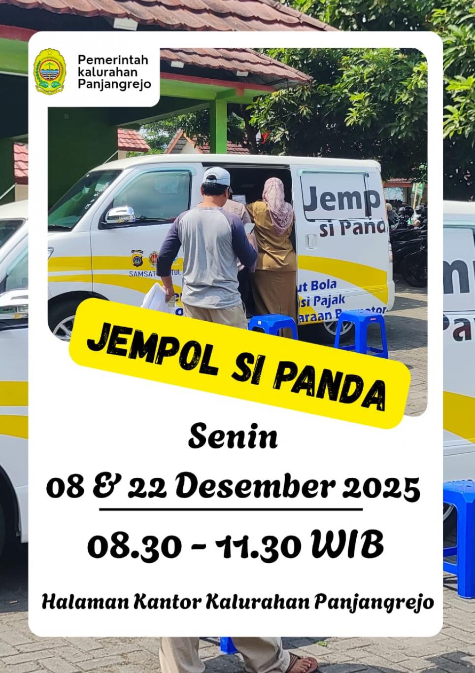 Pada Senin, 8 Desember 2025, Kalurahan Panjangrejo kembali menjadi lokasi penyelenggaraan Layanan Jempol Sipanda (Jemput Bola Pajak Kendaraan). Kegiatan yang berlangsung mulai pukul 08.30 hingga 11.30 WIB ini memberikan kemudahan bagi masyarakat dalam membayar pajak kendaraan bermotor, baik roda empat maupun roda dua, tanpa harus datang ke kantor Samsat.