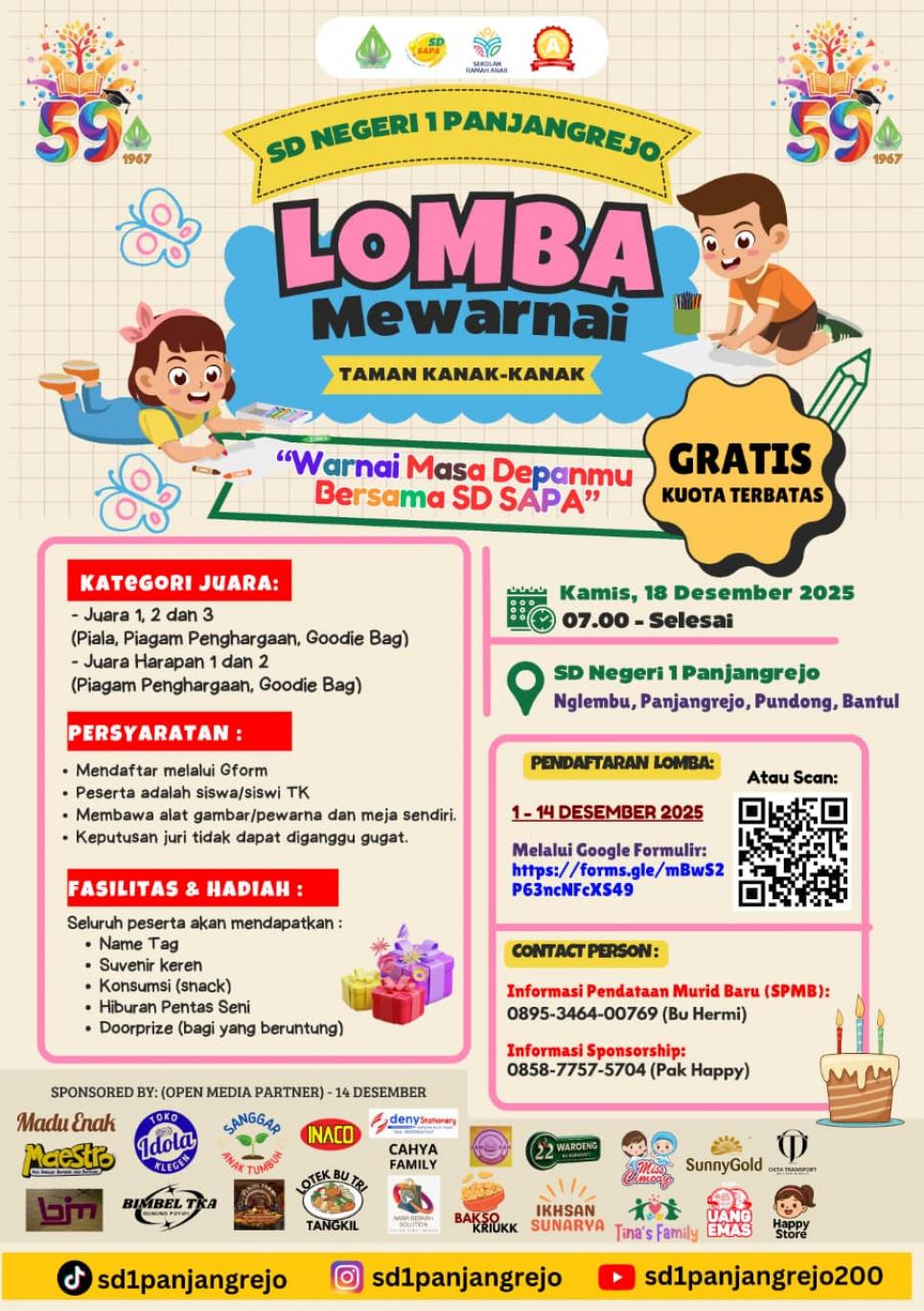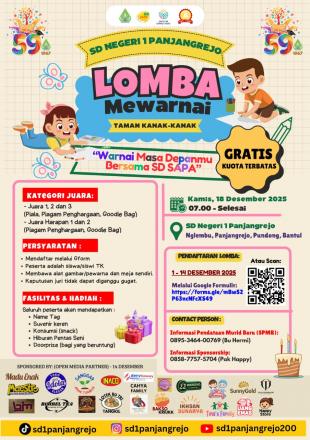 Dalam rangka memperingati Hari Ulang Tahun SD Negeri 1 Panjangrejo yang ke-59, SDN 1 Panjangrejo menyelenggarakan kegiatan Lomba Mewarnai dan Pentas Seni yang berlangsung dengan meriah dan penuh antusias. Kegiatan ini diikuti oleh peserta didik TK se-Kalurahan Panjangrejo sebagai bentuk pengenalan lingkungan sekolah serta wadah pengembangan kreativitas dan bakat seni anak sejak usia dini.