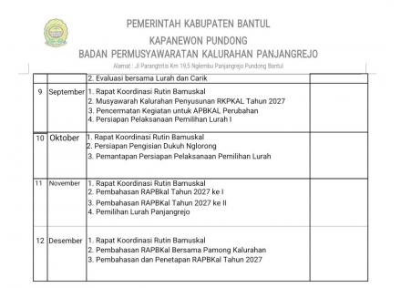 Badan Musyawarah Kalurahan (Bamuskal) Panjangrejo menyampaikan program kerja Tahun Anggaran 2026 kepada Pemerintah Kalurahan Panjangrejo. Kegiatan ini dihadiri oleh Lurah, Carik, Kasi, Kaur, pendamping kalurahan, serta staf kalurahan.