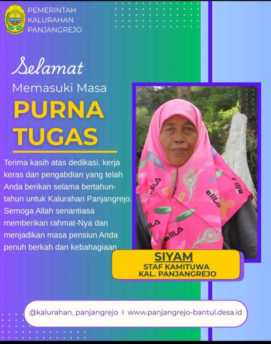 Dengan penuh rasa haru dan bangga, keluarga besar Kalurahan Panjangrejo melepas salah satu pamong terbaik yang telah menunaikan tugasnya dengan tulus, setia, dan penuh tanggung jawab. Bertahun-tahun mengabdi bukanlah waktu yang singkat. Setiap langkah, setiap keputusan, setiap pengorbanan telah menjadi bagian dari sejarah dan kemajuan Kalurahan Panjangrejo.