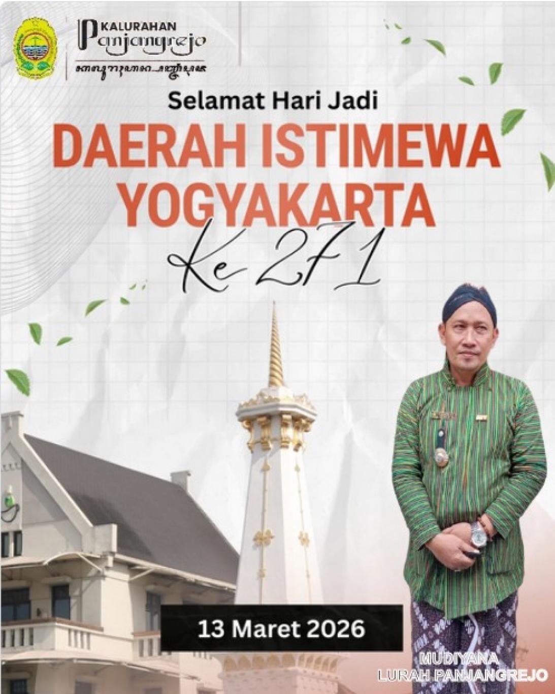 Pemerintah Kalurahan Panjangrejo mengucapkan Selamat Hari Jadi Daerah Istimewa Yogyakarta ke-271.